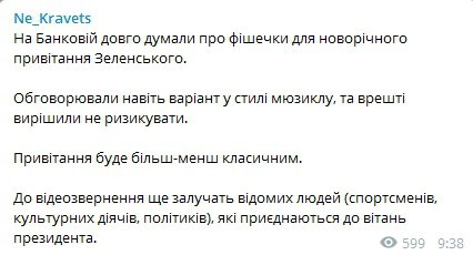 “На Банковій довго думали про фішечки для новорічного привітання Зеленського. Обговорювали навіть варіант у стилі мюзиклу, та врешті вирішили не ризикувати. Привітання буде більш-менш класичним”, – сказано в повідомленні.