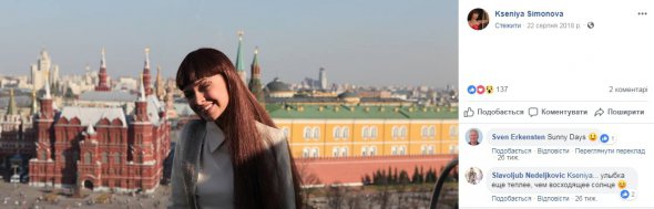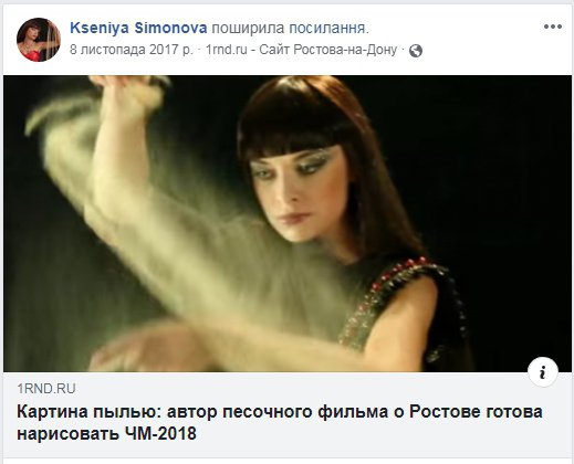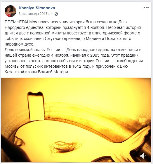Майстриня пісочної анімації, українка Ксенія Симонова, яка свого часу виграла конкурс “Україна має талант” і посіла третє місце в найпопулярнішому талант-шоу світу America’s Got Talent: Champions, виявилася прихильницею російського окупанта. До такого висновку можна дійти з її сторінки у Facebook повідомляє gazeta.ua